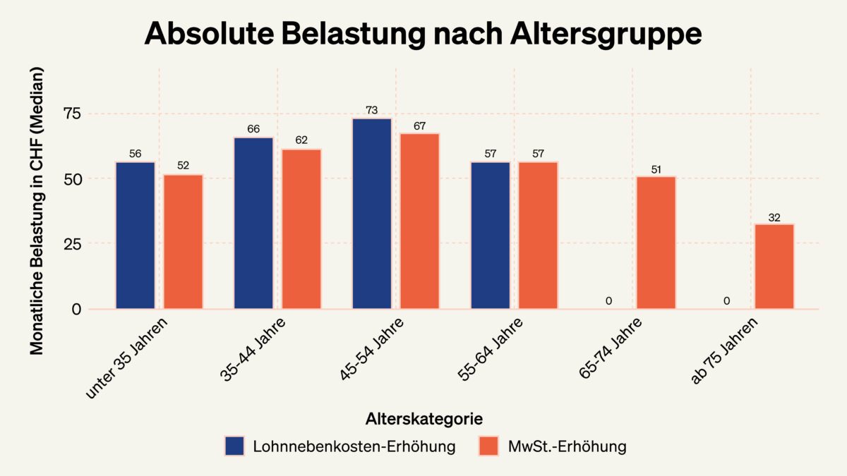 Die Studie stellt der Lohnbeitragserhöhung eine Erhöhung der Mehrwertsteuer gegenüber. Der zentrale Unterschied liegt in der Verteilung der Last. Lohnbeiträge belasten primär Erwerbstätige und konzentrieren sich stark auf die Erwerbsjahre. Die Mehrwertsteuer dagegen wird über den Konsum erhoben und verteilt die Finanzierung breiter über alle Altersgruppen und Einkommensarten.