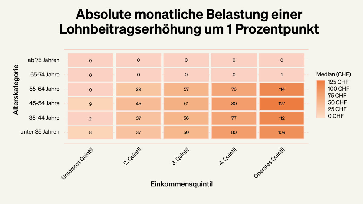 Ein Beispiel aus der Studie macht das greifbar: Haushalte im Alter von 45 bis 54 Jahren mit mittlerem Einkommen zahlen bei plus 1 Prozentpunkt im Median rund 61 Franken pro Monat mehr. In höheren Einkommensgruppen liegt die monatliche Mehrbelastung deutlich darüber. Was auf dem Lohnzettel nach wenig aussieht, summiert sich über Jahre und Jahrzehnte zu erheblichen Beträgen und schmälert den finanziellen Spielraum genau in der Lebensphase, in der er am dringendsten gebraucht wird.