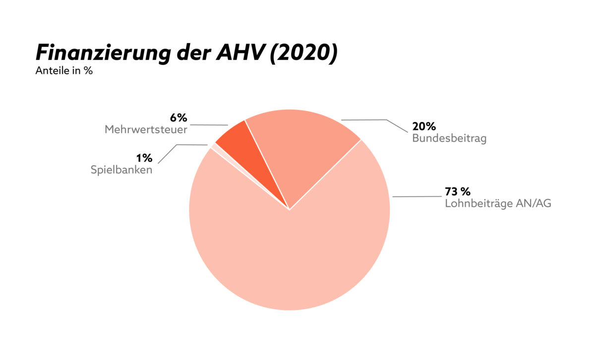 Die AHV wird nach dem sogenannten Umlageverfahren finanziert. Das bedeutet: Die heutigen Erwerbstätigen und ihre Arbeitgeber zahlen mit ihren Lohnbeiträgen die Renten der aktuellen Rentnerinnen und Rentner. Das Geld, das jeden Monat eingenommen wird, wird direkt wieder ausgezahlt. Dieses Prinzip basiert auf der Solidarität zwischen den Generationen.